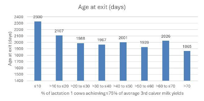Age at exit (days) demonstrated the same pattern. Cows within herds whereby ≤10% of lactation 1 cows achieved ≤75% of average 3rd(+) calver milk yields had an average age at exit of 2,330 days. Average age at exit broadly decreased as the % of lactation 1 cows achieving ≤75% of average 3rd(+) calver milk yields increased. Cows within herds whereby >70% of lactation 1 cows achieved ≤75% of average 3rd(+) calver milk yields had an average age at exit of 1,865 days (Figure 2).